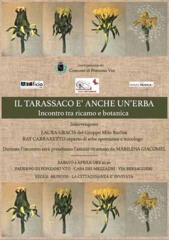 In questa occasione, con il patrocinio del Comune di Ponzano Veneto, Ricamo e Botanica s’incontreranno per parlare di Tarassaco e per ammirare il pannello ricamato a punto raso da Marilena Giacomel che riproduce le varie fasi della fioritura di questa pianta erbacea.
