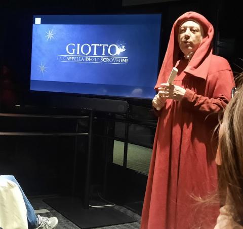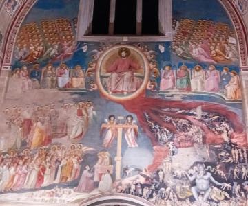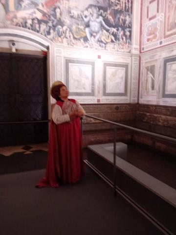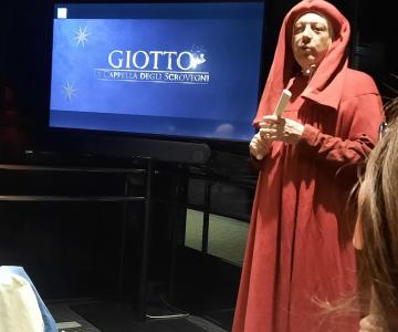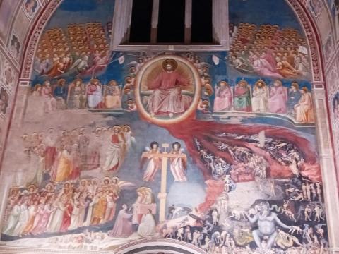 Martedì 14 ottobre abbiamo visitato con gli attori della compagnia teatrale TEATRORTAET la Cappella degli Scrovegni, capolavoro di Giotto. Le storie di Maria e di Gesù culminano nel Giudizio Universale, dove Salvezza e Dannazione trovano la loro apoteosi. Tra i dannati Rinaldo Scrovegni, da tutti conosciuto come usuraio impenitente e dannato, Dante infatti lo tratteggiò con un celebre ritratto nell'Inferno della sua Divina Commedia. Il figlio Enrico, il committente degli affreschi, è raffigurato nell'atto di donare la cappella a S. Maria della Carità, a S. Giovanni Battista e a S. Caterina d'Alessandria.